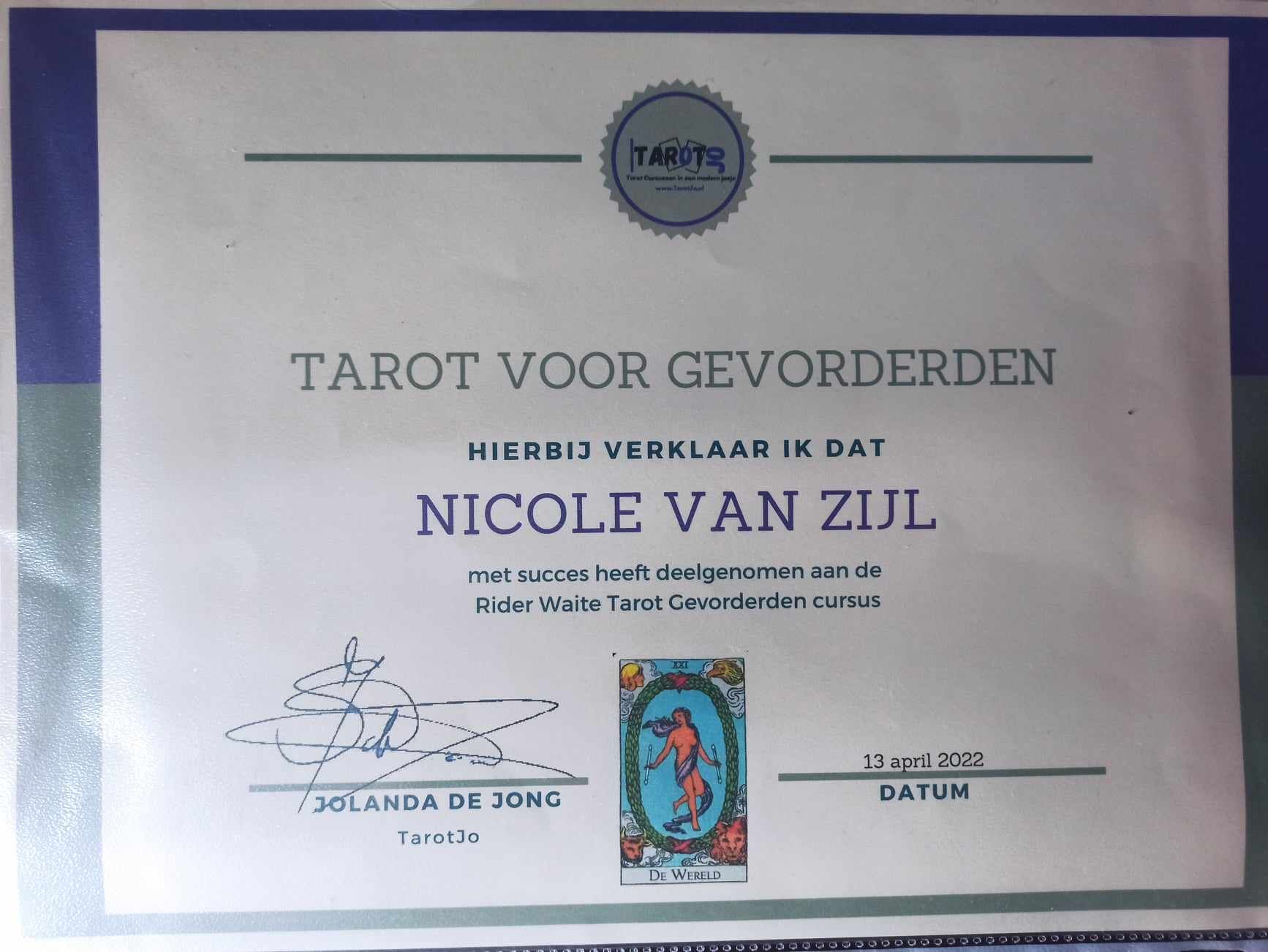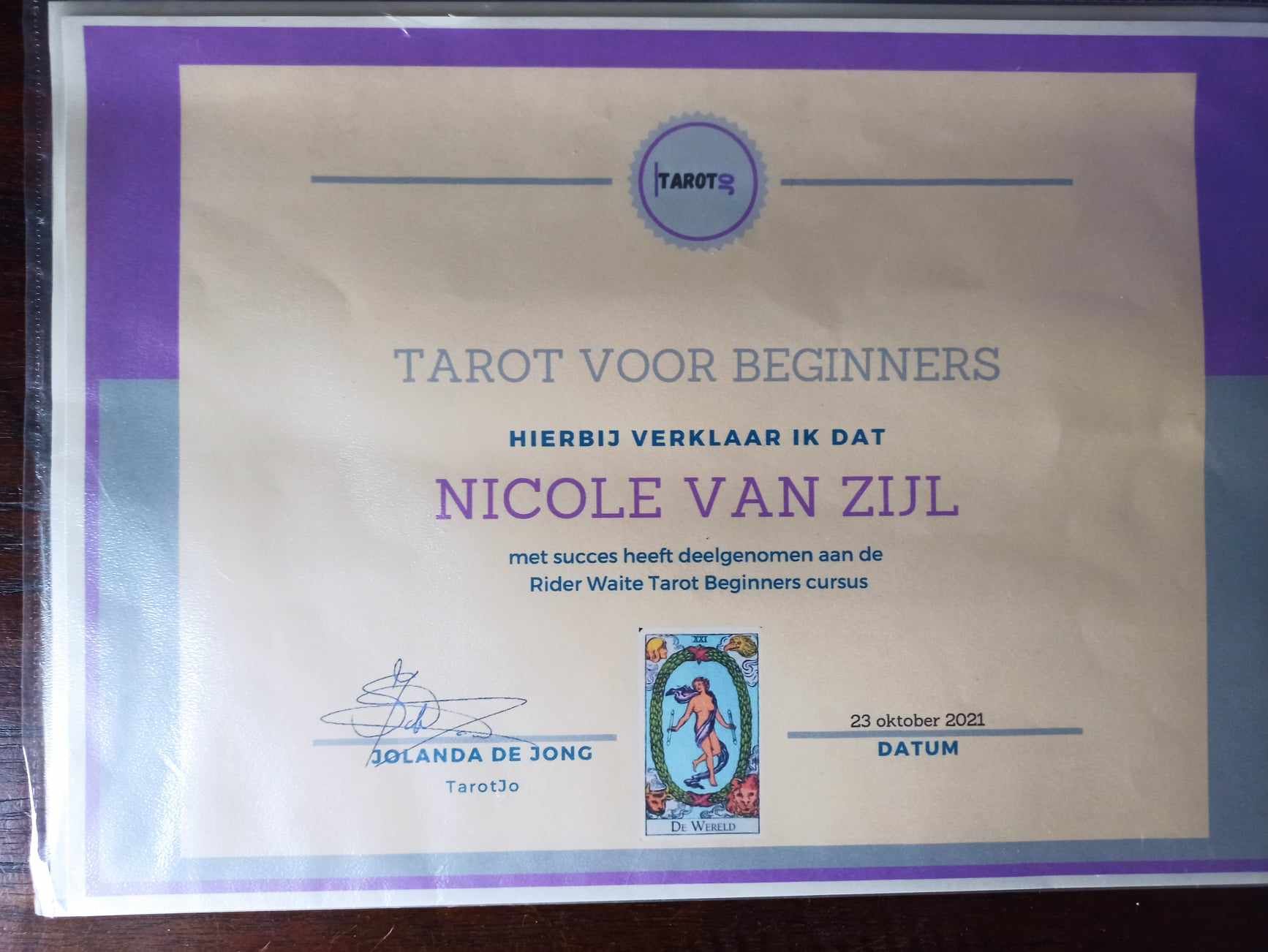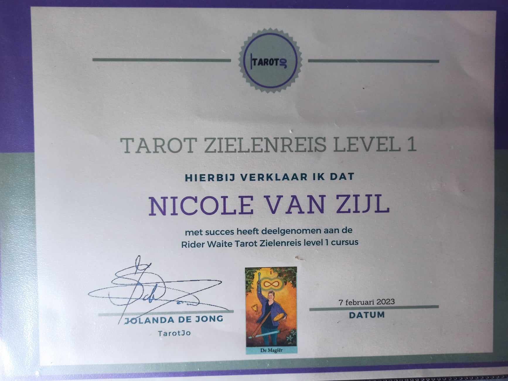 In 2021 ben ik begonnen met mijn eerste tarotcursus en ben daarna meer cursussen gaan volgen. Ondertussen had ik ontdekt dat kaarten leggen voor mensen leuk is. Het idee dat je mensen kan helpen om inzichten te krijgen waarmee ze verder kunnen vind ik dan ook bijzonder en dankbaar om te mogen doen. Naast de tarotcursussen heb ik ook orakelkaarten cursussen gedaan. Bij beide cursussen heb ik ook certificaten gekregen.