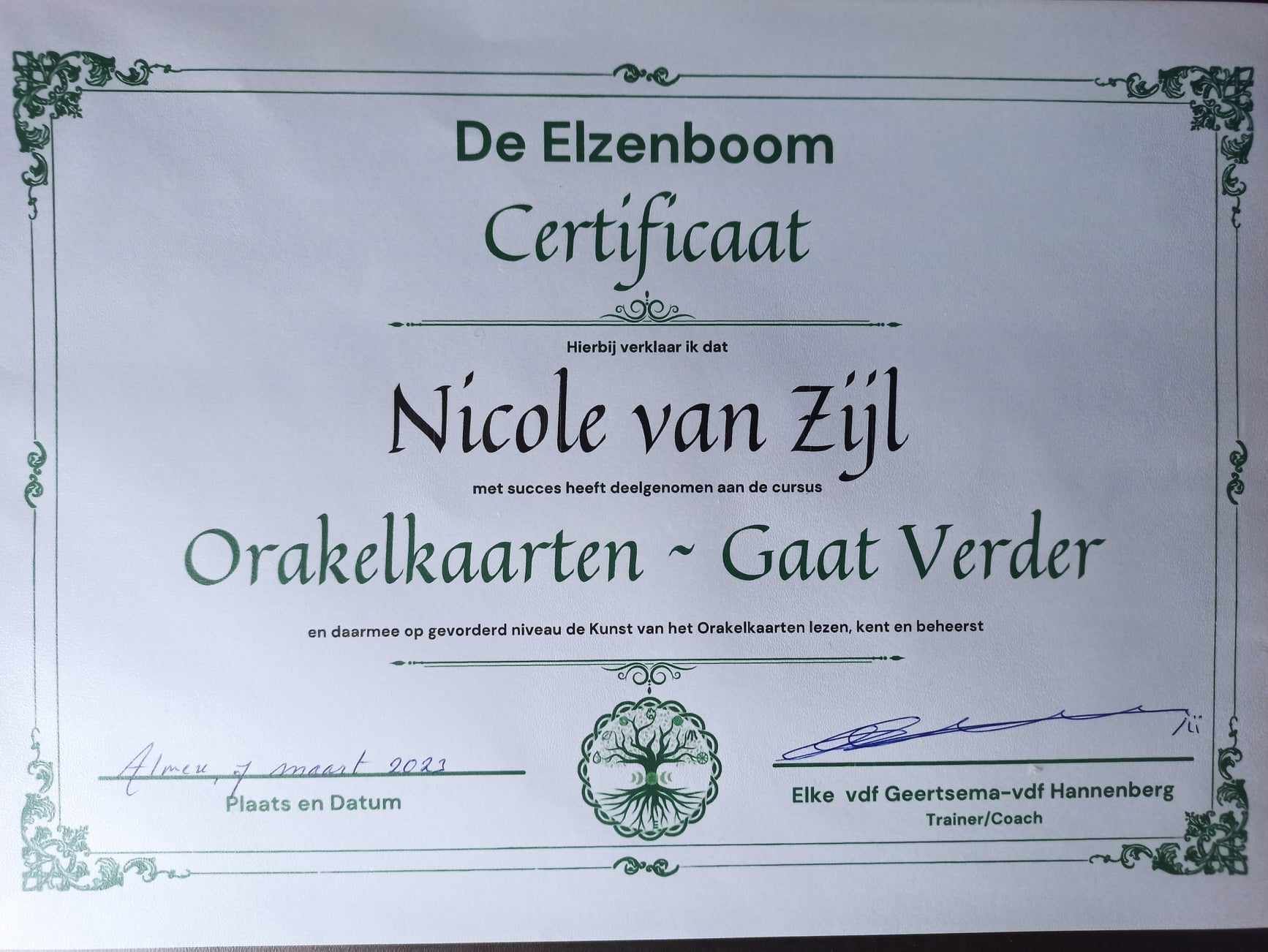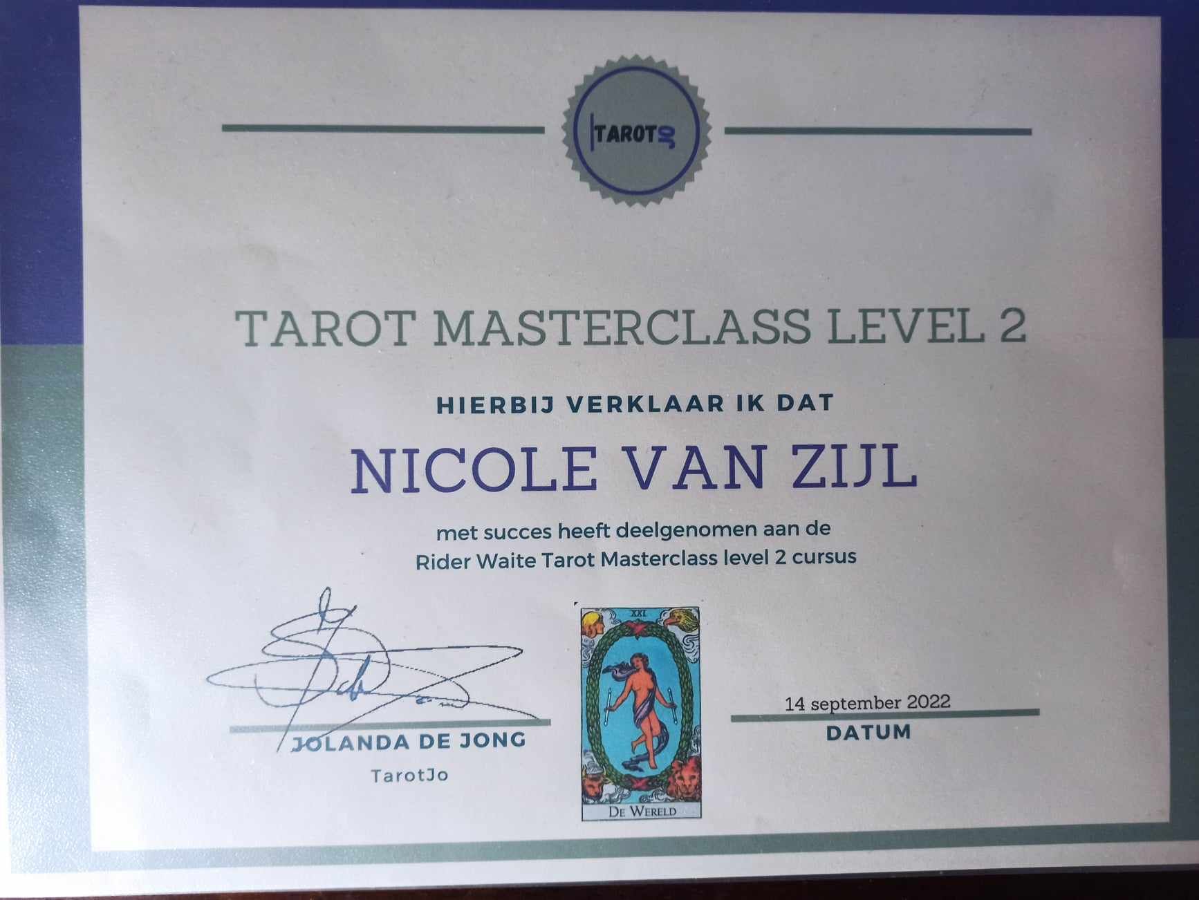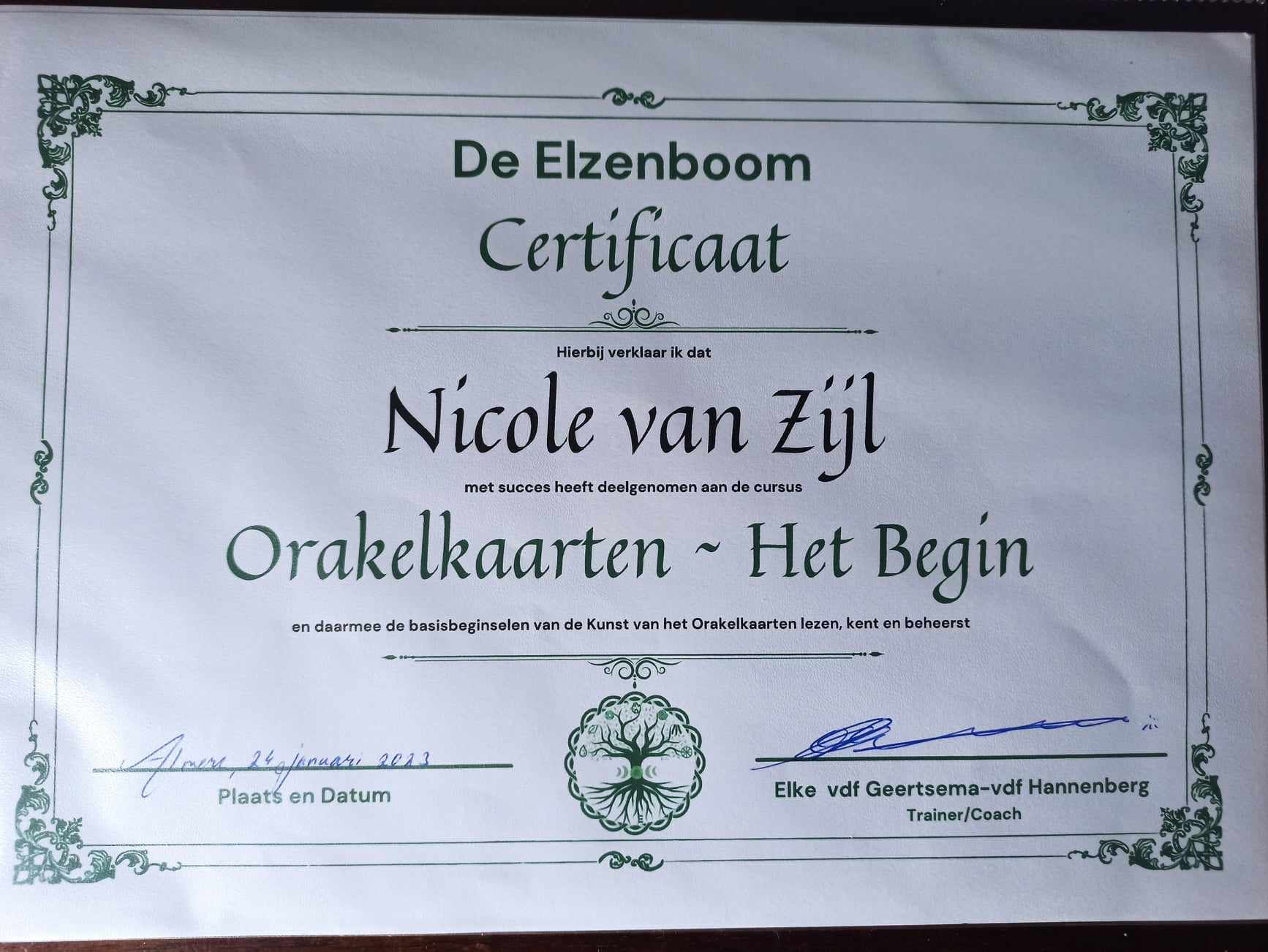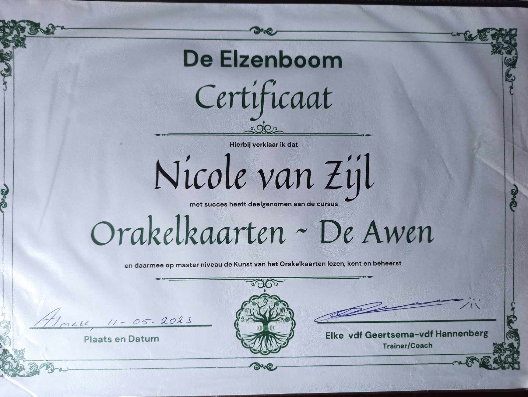In 2021 ben ik begonnen met mijn eerste tarotcursus en ben daarna meer cursussen gaan volgen. Ondertussen had ik ontdekt dat kaarten leggen voor mensen leuk is. Het idee dat je mensen kan helpen om inzichten te krijgen waarmee ze verder kunnen vind ik dan ook bijzonder en dankbaar om te mogen doen. Naast de tarotcursussen heb ik ook orakelkaarten cursussen gedaan. Bij beide cursussen heb ik ook certificaten gekregen.